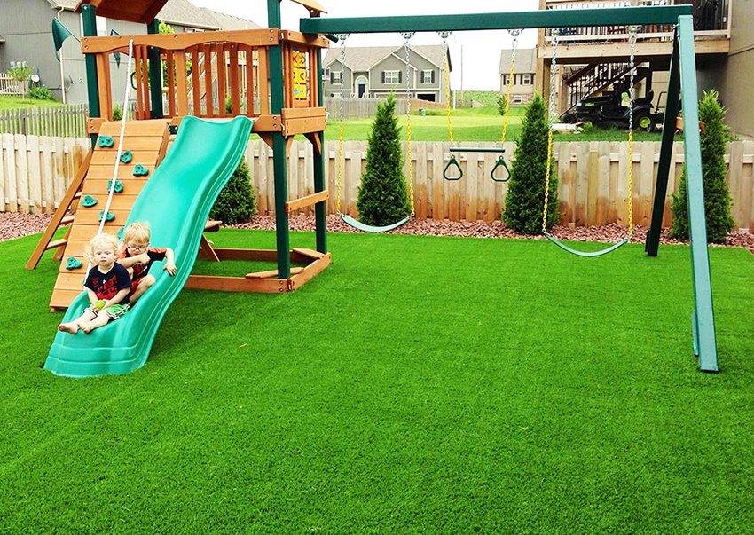 Существующие специальные покрытия для игровых зон на резиновой основе полностью удовлетворяют этим требованиям, но они очень дорогостоящие, плюс такой вид покрытия больше подойдет для спортивной площадки, на даче же хочется чего-то больше натурального, природного. Поэтому в качестве покрытия оптимально подойдет газон из стойких сортов травы – такие используют, например, для футбольных полей, на детской площадке нагрузка будет не меньше. Но лучше использовать комбинированное покрытие, например, возле горок и гимнастических снарядов стоит сделать песчаное покрытие – при падении оно смягчит удар.
