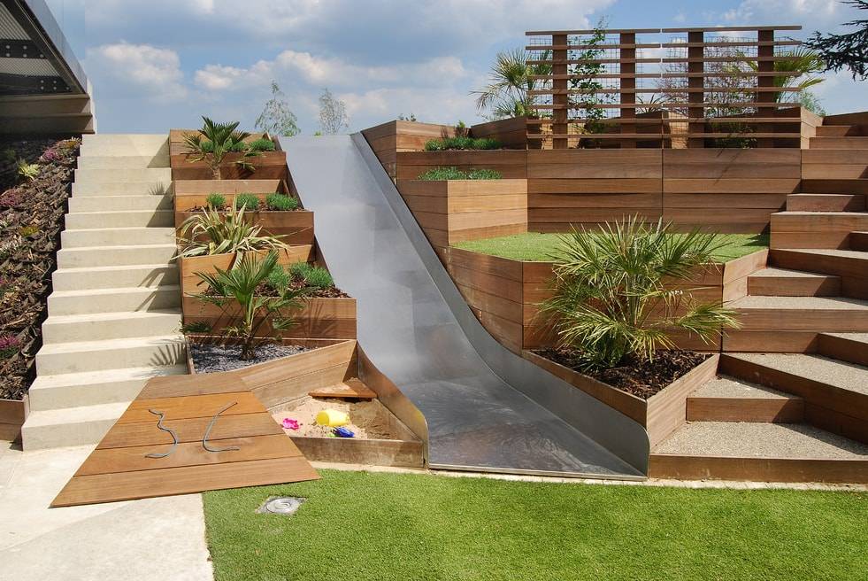 Сейчас в продаже довольно много разных комплексов для дачной детской площадки, и их сильная сторона не только в компактности, но и в модульности: можно постепенно подкупать новые элементы, площадка будет расти вместе с детьми и совершенствоваться под их потребности. В самую простую комплектацию таких комплексов входят горка, качели, песочница и скамейка. Но можно купить целые лабиринты с тоннелями, веревочными лестницами, горками, сетками, мостиками. Подросткам можно купить такие же модульные спортивные площадки.