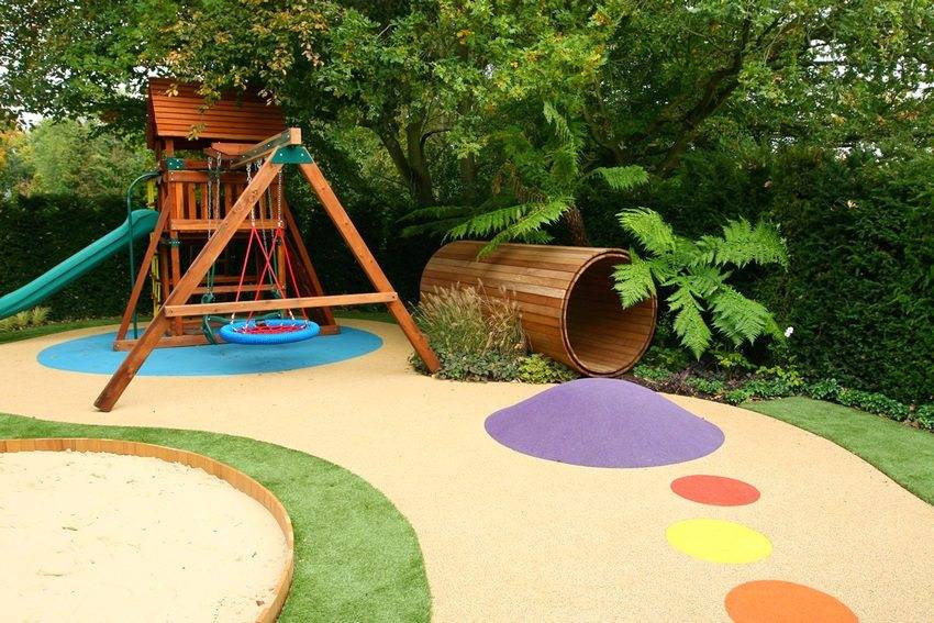 Отдельного внимания потребует покрытие для детских площадок на даче – оно должно быть мягким, чтобы смягчить падение, и быстросохнущим – играя, дети много времени проводят на земле, а чрезмерная влажность может спровоцировать простуду.