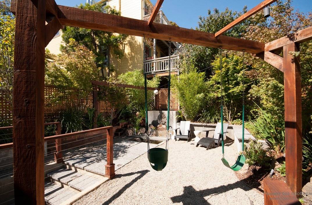 Следующий, довольно бюджетный вариант для площадки – качели. Абсолютно все дети, независимо от возраста, их просто обожают. Если вы собираетесь приобрести готовую конструкцию, то лучше всего выбирать пластиковые качели. Для самых маленьких выбирайте варианты с ремнями безопасности и спинкой.