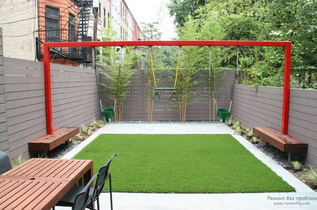 Размеры игровой зоны зависят от площади участка и устанавливаемого оборудования. Чаще всего там размещают качели, небольшую песочницу, спортивные снаряды для мальчиков и маленький бассейн. Часть территории обязательно должна иметь мягкое покрытие или быть засажена травой, чтобы дети могли играть сидя или лежа. Для расстановки всего вышеперечисленного вполне достаточно 5-6 м².