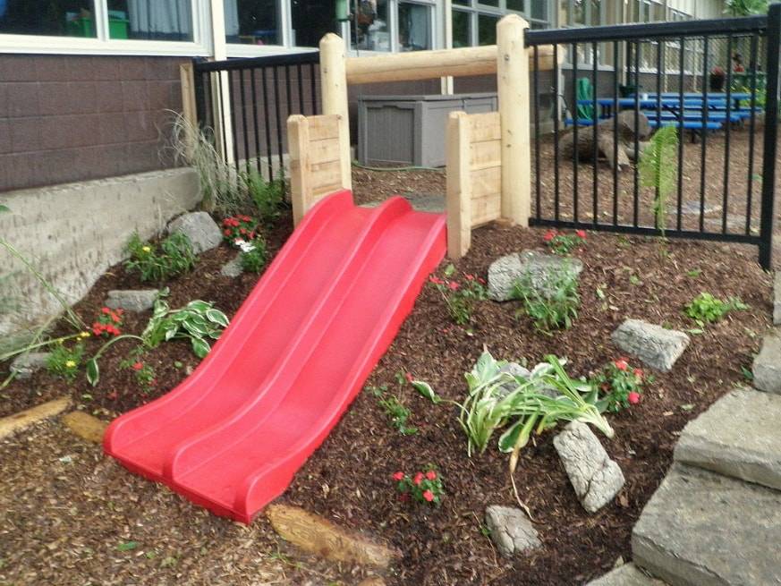 По примерным прикидкам, горке нужно 15 кв метров дачной территории, качелям тоже, карусели – 20 кв. метров. На небольшом участке сложно найти столько места, лучше купить готовый игровой комплекс – они довольно компактные, все радости детской жизни можно уместить на 15-20 метрах.