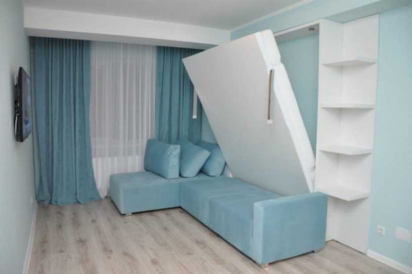 - кровать-диван — в дневное время кроватный матрас поднят вверх параллельно стене и представляет собой спинку дивана и стеллажи, а для сна он опускается параллельно полу и получается полноценная кровать;