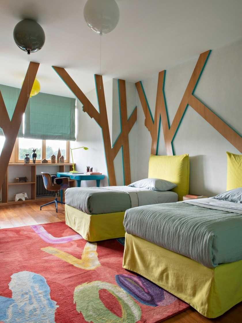 Поверхность лимонной деревянной стены изысканно подчеркнули дизайнерскими обоями с трафаретной печатью. Виниловый материал под названием «Лес» придумал еще в прошлом столетии англичанин Михаэль Кларк. Для оклейки стен полотнами с изображением деревьев использовали клей и мягкий валик.