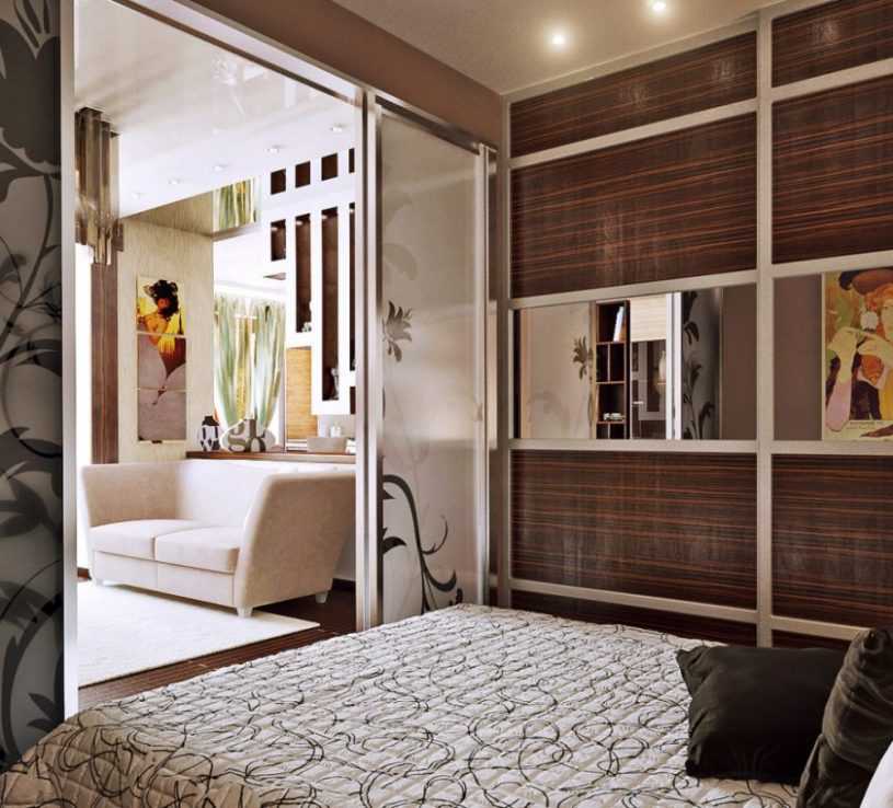 В спальне гостиной 17 кв м организация отдельного уголка для кровати также бывает проблематичной. Для ниши нет места, а непрозрачная стенка или штора сделают помещение тесным, одна из зон получится темной. Выставлять какие-то предметы, которые хотя бы визуально разделят пространство на две части тоже не выход, так мы только захламим комнату. Ситуацию спасет перегородка с рельефным стеклом.