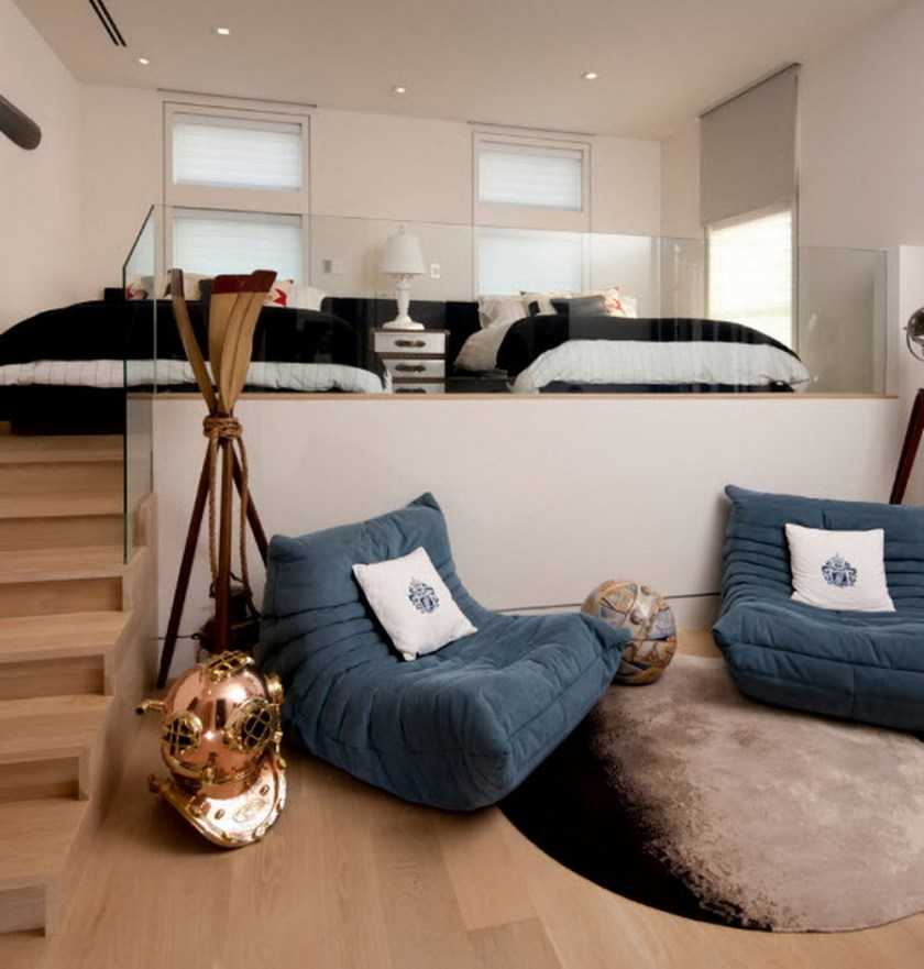 Владельцам квартиры с высокими стенами очень повезло, так как они могут эффектно разделить спальню и гостиную при помощи создания нового уровня. Отлично смотрятся этажи, которые расположены выше уровня гостиной. К такой спальне ведет лестница.