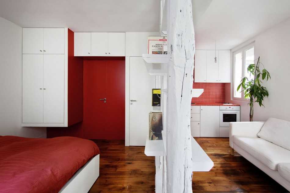 Иногда приходится использовать одну комнату для разных целей. В этом случае можно создать отдельные функциональные зоны с полками, шкафчиками, которые будут выполнять роль ширм. Складывание или трансформация мебели поможет сэкономить место.