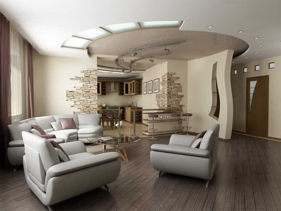 Гостиная прямого назначения не требует изолирующих от кухни элементов. Угловая мебель, барная стойка или различия в декоре окон достаточно четко разграничат пространство между зоной приготовления пищи и зоной отдыха.