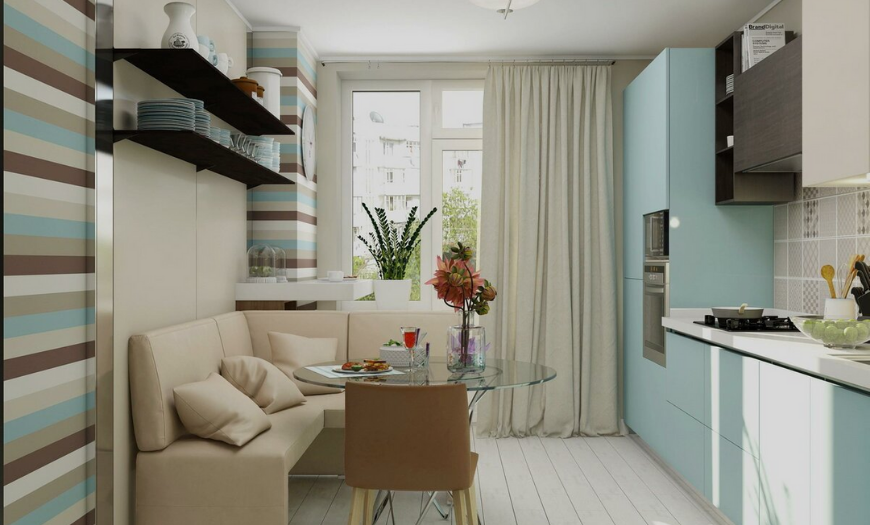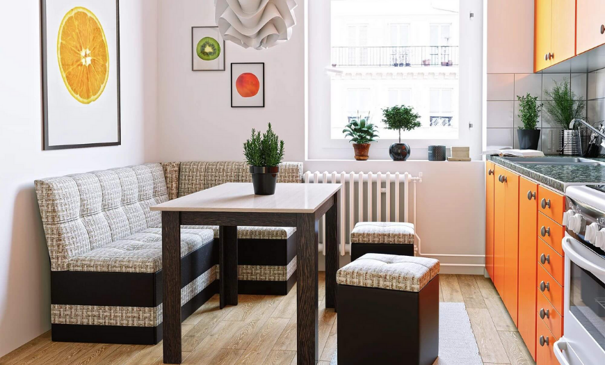 Небольшая модель дивана с практичным спальным местом органично впишется в небольшую комнату площадью 9 кв. Такая конструкция рационально использует квадратные метры и превращает кухонное пространство в дополнительное уютное место отдыха.