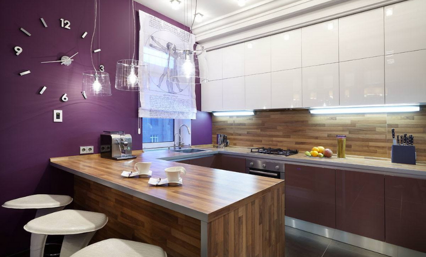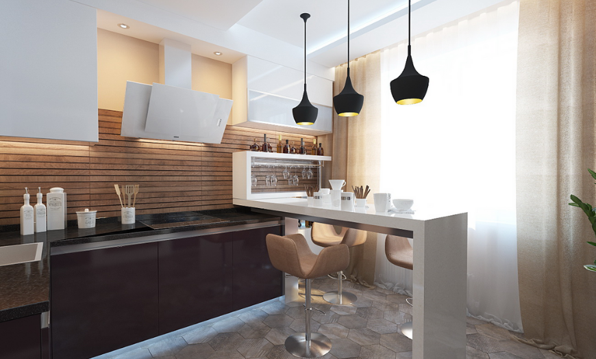 Это идеальный вариант экономии пространства. Органично смотрится сочетание стойки и прямого кухонного гарнитура. Конструкцию особенно оценят энергичные люди, которые немного времени проводят на кухне.