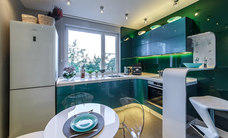 - Одним из значимых трендов в дизайне маленьких кухонь является использование стекла и зеркал. Прозрачные кухонные фасады, столешницы со стеклянным покрытием и зеркальные элементы декора делают кухню значительно менее тесной.