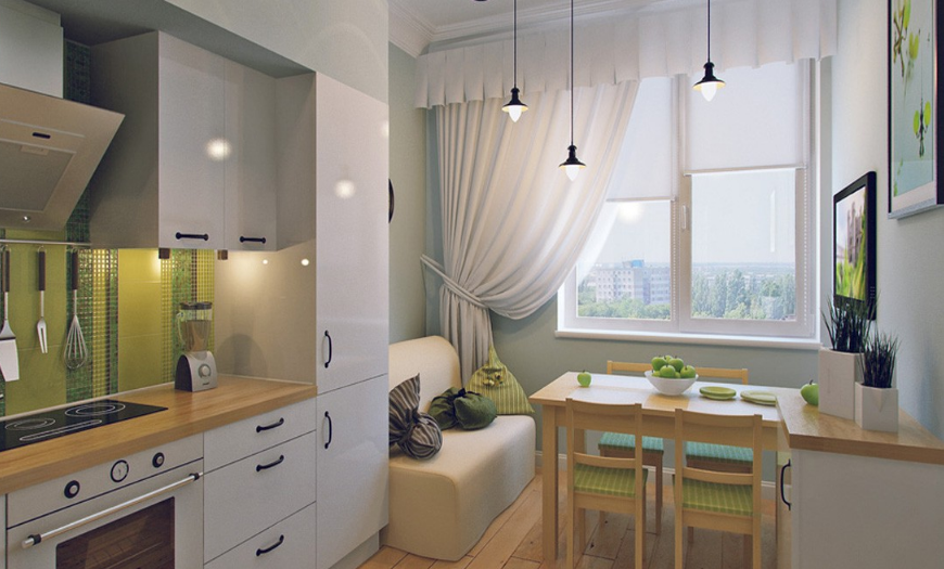 - В случае если в кухне расположена дверь на лоджию – можно ее убрать, а на месте подоконника установить столешницу или барную стойку. Так мы получим прирост около 2 квадратных метров площади.