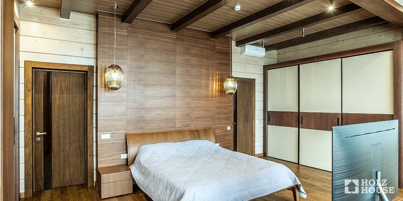 Со стороны спальни она имеет открытую нишу, которая заменяет хозяевам прикроватную тумбу. Еще одна тумба подвешена к стене – под ней можно разместить пуф для экономии пространства.