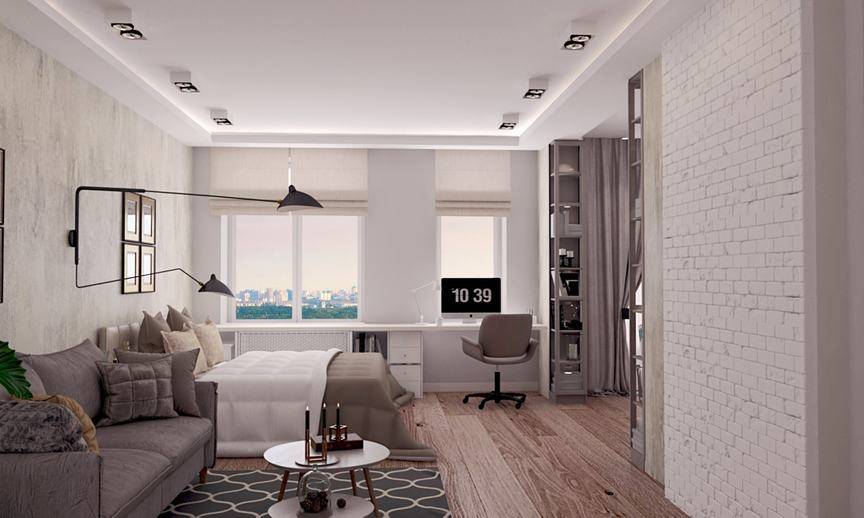 В свою очередь, сегмент для сна и отдыха можно выделить с помощью обычного ковра. Для кухонной зоны специалисты рекомендуют подбирать светодиодное освещение. Оставшуюся площадь будет покрывать люстра. Что касается разделения зон для сна и работы, то существует два основных варианта для этого. Первый из них учитывает оформление комнаты в виде гостиной. В таком случае местом для сна будет служить раскладной диван. Основное преимущество такого метода заключается в максимально целесообразном использовании площади помещения.