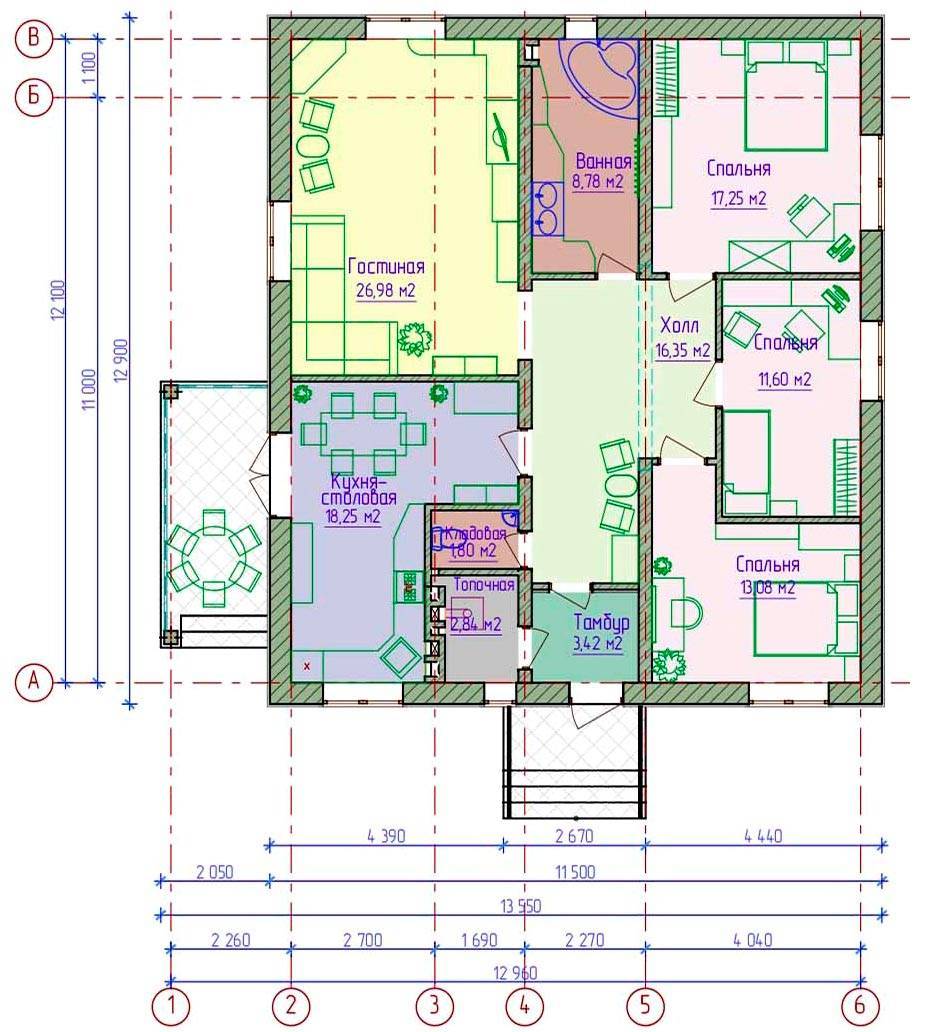 Практически любая планировка одноэтажного дома площадью 150 кв м позволит разместить следующие виды помещений: