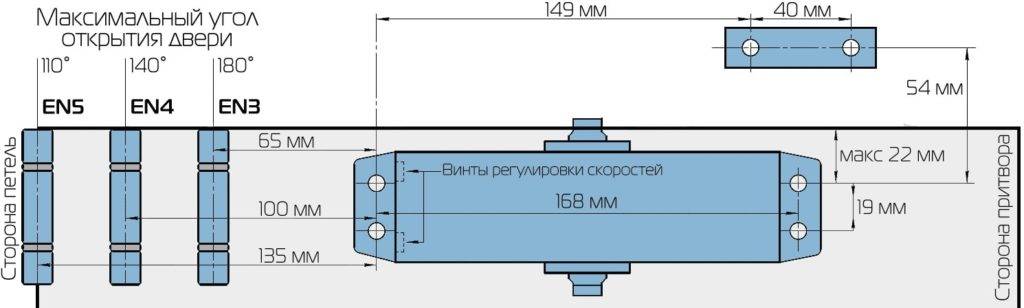 И здесь задача мастера значительно упрощается. Изделия комплектуются специальными установочными шаблонами. Они выполнены в масштабе 1:1 и универсальны, так как учитывают различные способы открывания дверей и навеса полотен. Остается лишь приложить трафарет доводчика по месту и наметить точки сверления каналов для установки крепежных деталей.