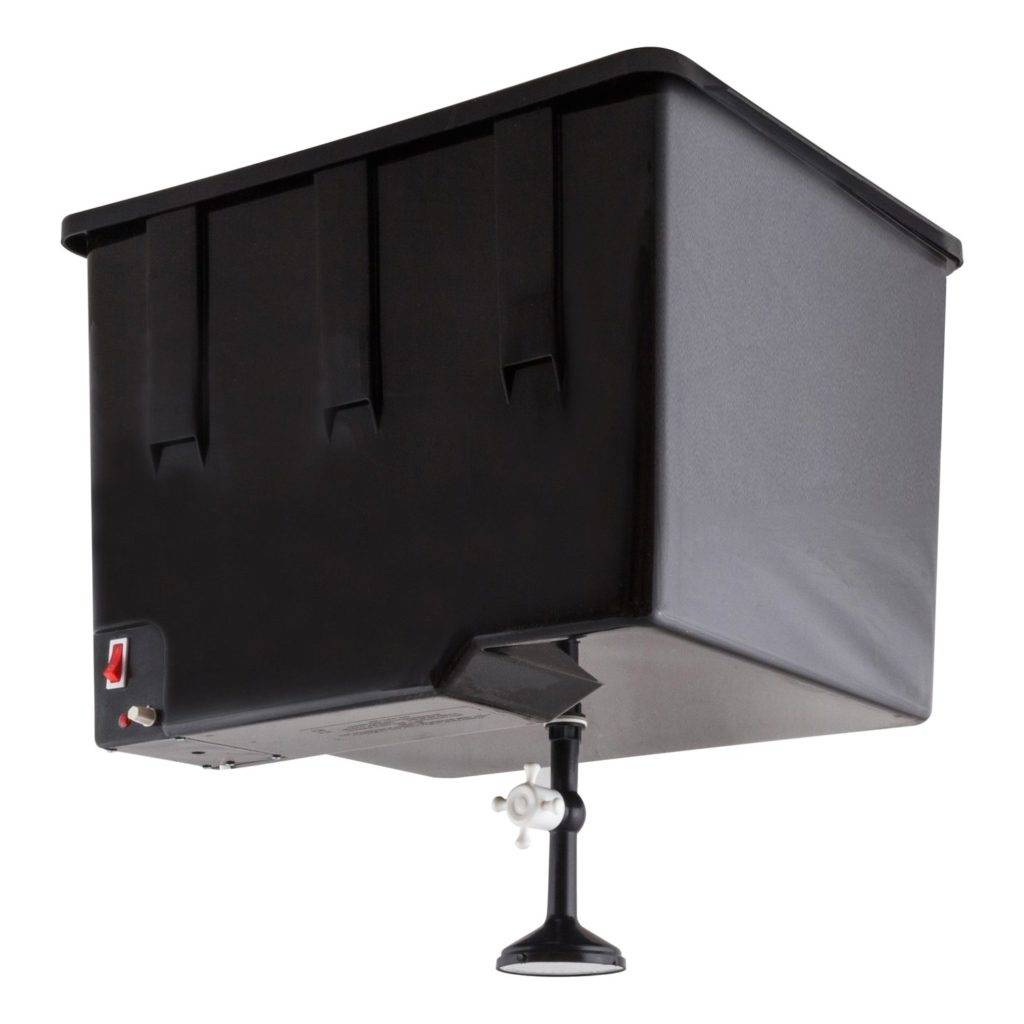- Плоский бак со встроенной лейкой. Напоминает по принципу работы бройлер. Вода в баке должна быть постоянно.