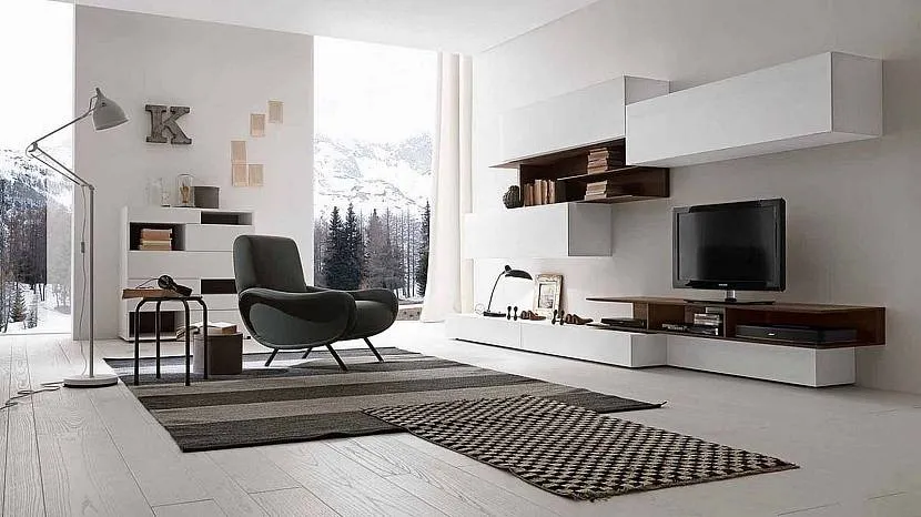 Обычно здесь мы отдыхаем или принимаем гостей. Почти всегда это стандартный набор — диван, телевизор, журнальный столик. Оцените ваши потребности. Если на диване часто ночуют гости, то необходимо место, чтобы его разложить. Если вы любите читать, то понадобятся стеллажи, их можно заменить настенными полками и высвободить место на полу