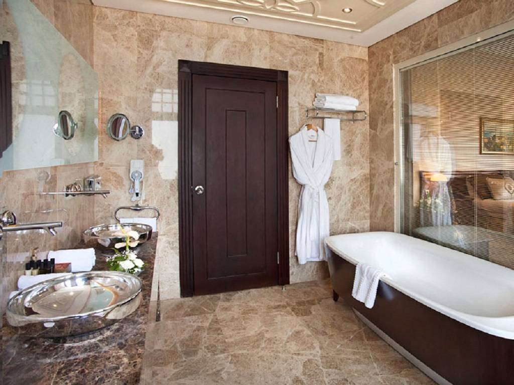 Деревянная дверь в ванную комнату из шпона дополнительно обрабатывается клеем. При эксплуатации на полотно не должна попадать вода, иначе изделие будет деформироваться. Чтобы этого избежать, необходимо устанавливать изделие из шпона на существенном расстоянии от сантехнических приборов, а это условие сложно выполнить. Если выбирают двери для туалета и ванны, на высокую механическую прочность при этом рассчитывать не следует, т. к. и дерево, и шпон сравнительно легко деформируются