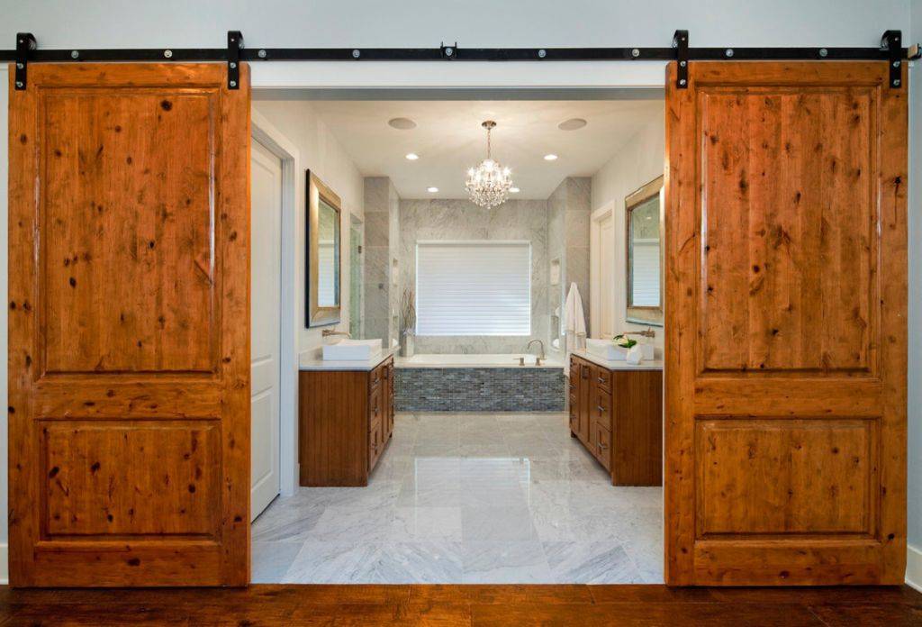 Это дорогостоящие материалы, которые характеризуются рядом особенностей. Такие двери для ванной выбирают, если в интерьере присутствуют элементы декора в аналогичном стиле. Они характеризуются привлекательностью, но сложны в уходе. Перед установкой изделие из дерева обрабатывают антисептиком, и дополнительно строительным лаком, причем несколько раз. Если планируется применять натуральный шпон, его следует пропитать влагоустойчивым составом, что позволит улучшить характеристики материала.