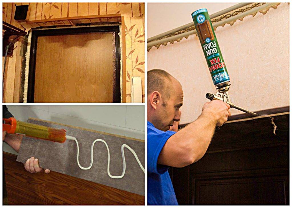 В завершение отделки выступающую пену зачищают малярным ножом. При необходимости её потребуется зашпаклевать, чтобы исключить разрушающее воздействие внешних факторов (температуры и влажности). При этом новые дверные откосы должны оставаться чистыми, и поэтому их придётся аккуратно оклеить малярной лентой.