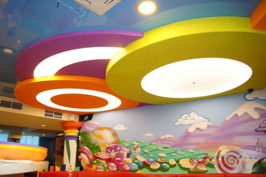 Все варианты, в которых делают разноцветный потолок, перечислить невозможно. Назовём наиболее распространённые: