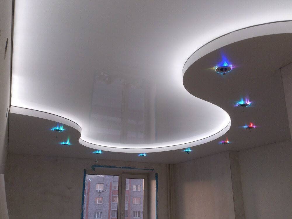 Двухуровневый натяжной потолок волна с точечными светильниками и светодиодной подсветкой