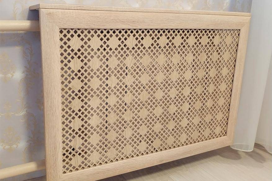 Производится решетка из металлической сетки, панели МДФ. Алгоритм работы похож на этапы создания короба. При наличии опыта и умений можно сделать щит в виде деревянной реечной структуры по типу жалюзи. Тогда рейки будут размещаться в любом направлении: вертикальном, горизонтальном, диагональном. При желании можно сделать экран для радиатора своими руками из ячеек, но такая структура будет сложнее, так как все элементы нужно разместить под прямым углом.