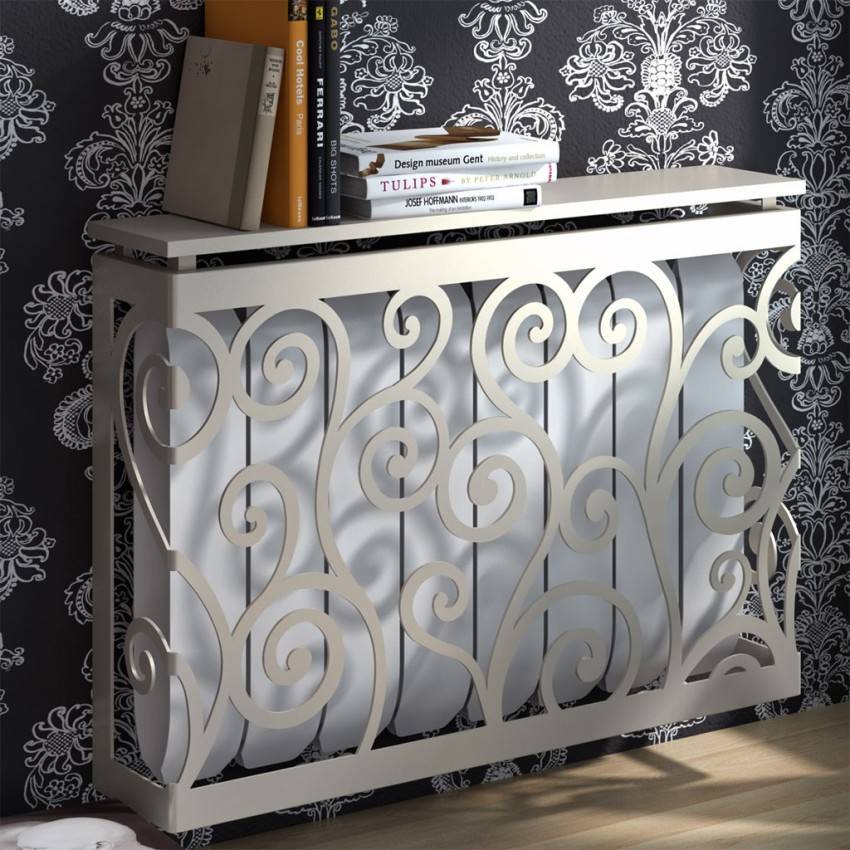 Не обязательно делать своими руками, можно заказать по вашим размерам и сделают фасад для батареи. Фасад представляет собой красивые решётки, они могут быть перфорированными или резные. Перфорированные экраны обрамлены металлической полоской их просто можно закрепить своими руками. Резные решётки для радиаторов могут быть художественными произведениями, за которыми не всегда можно увидеть радиатор. Резные решётки могут быть изготовлены с применением новейших технологий, например с помощью лазерной гравировки. Из МДФ плит изготавливают резные авторские работы.