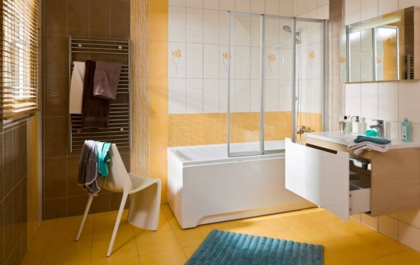 В конструкциях комбинированного типа присутствуют как распашные дверцы, так и панели на роликах. Экраны состоят как минимум из трех секций. Конструкция оборудования либо центральной частью с классической дверкой и двумя боковыми на роликах, либо наоборот. Разнообразие цветовой гаммы изделий позволяет подобрать покупателю вариант, оптимально подходящий под интерьер ванной комнаты.
