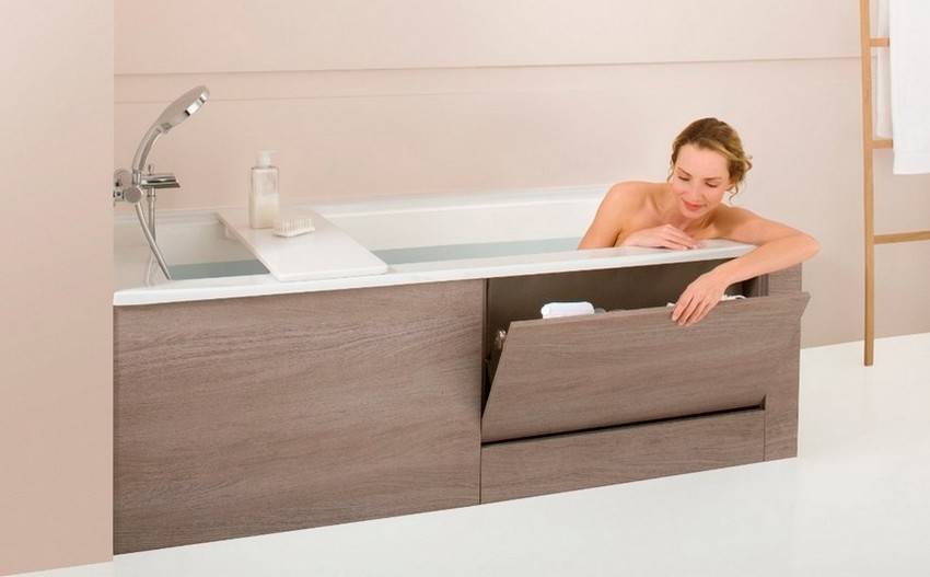 Внутри экранов размещаются полки, ниши или небольшие отсеки, позволяющие хранить не только пузырьки с моющими средствами, но и принадлежности для принятия процедур: полотенца, шапочки, щетки, массажеры и прочее. По мнению опытных покупателей, откидные модели экранов со встроенной системой хранения являются самыми практичными из всех вариантов, представленных на рынке.