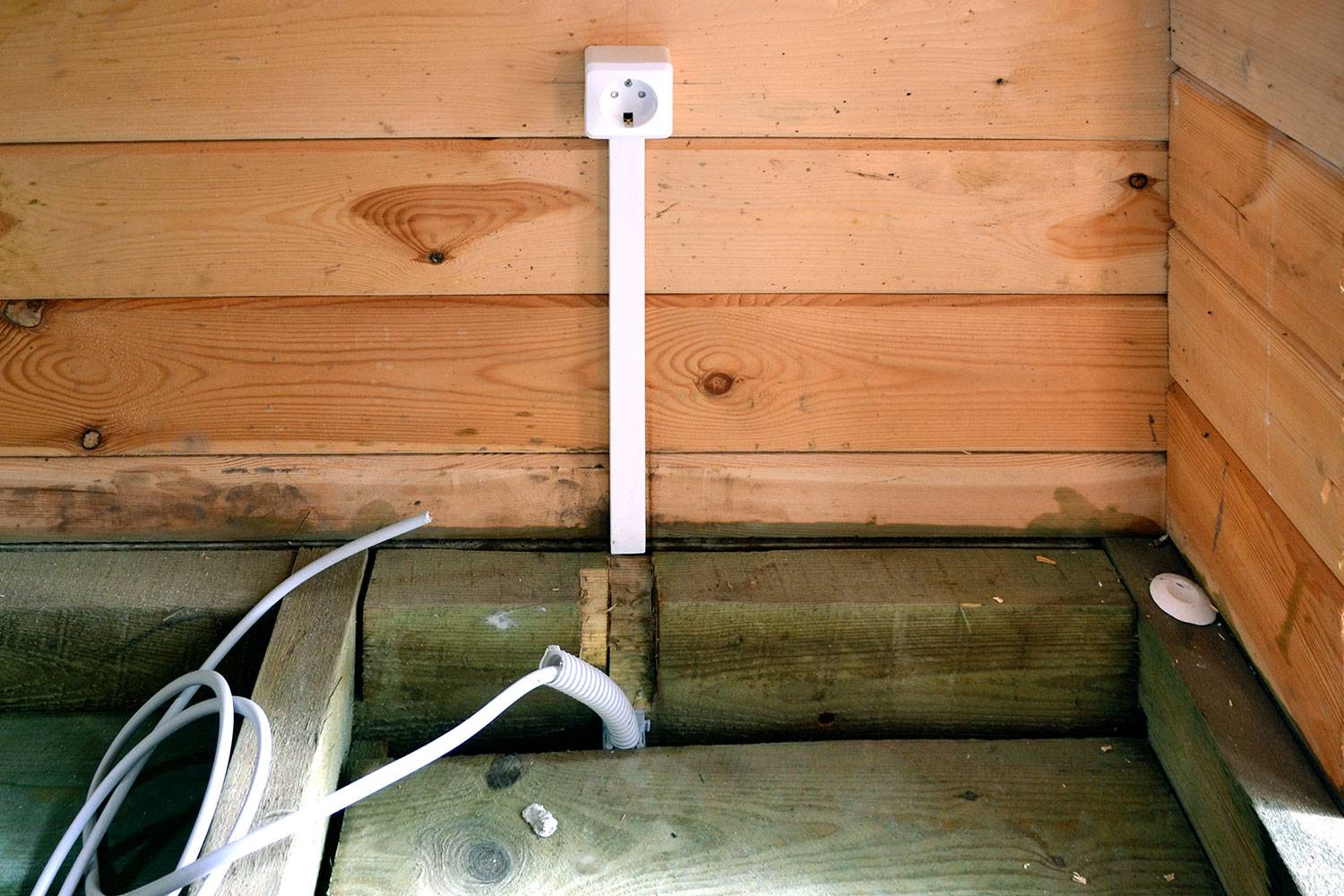 Распаечные коробки, розетки и выключатели необходимо выбирать только в брызгозащитном варианте для внешней проводки. Внутренности изделия должны быть закрыты корпусом со всех сторон. Ввод рекомендуется проводить снизу, с U-образным коленом, так как конденсат не будет затекать внутрь изделия. Электропроводка в деревянной бане до электрических приборов должна проходить по самому короткому пути. Никогда не ведите провод над печкой!