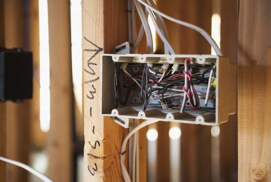Розетки и выключатели устанавливаются поверх обшивки или на отделанную поверхность стен. К этому моменту проводка должна быть разведена по всем помещениям, а в точках крепления розеток и выключателей сделаны монтажные петли или тупиковые концы с небольшим монтажным запасом длины.