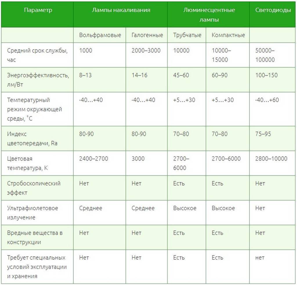 Сравнительная таблица различных ламп