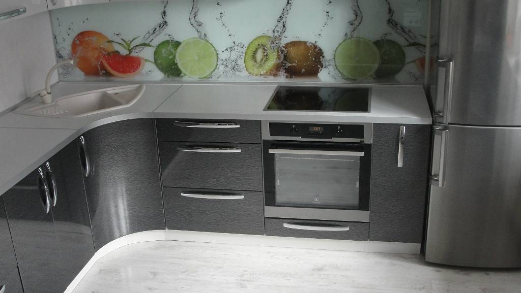 Любой гнутый фасад стоит дороже обычного примерно на 30%. Пластиковые гнутые фасады не исключение. Их применяют в основном в угловых кухонных гарнитурах, где радиальные створки шкафов выглядят вполне уместно. Чаще всего это крайние или угловые секции.