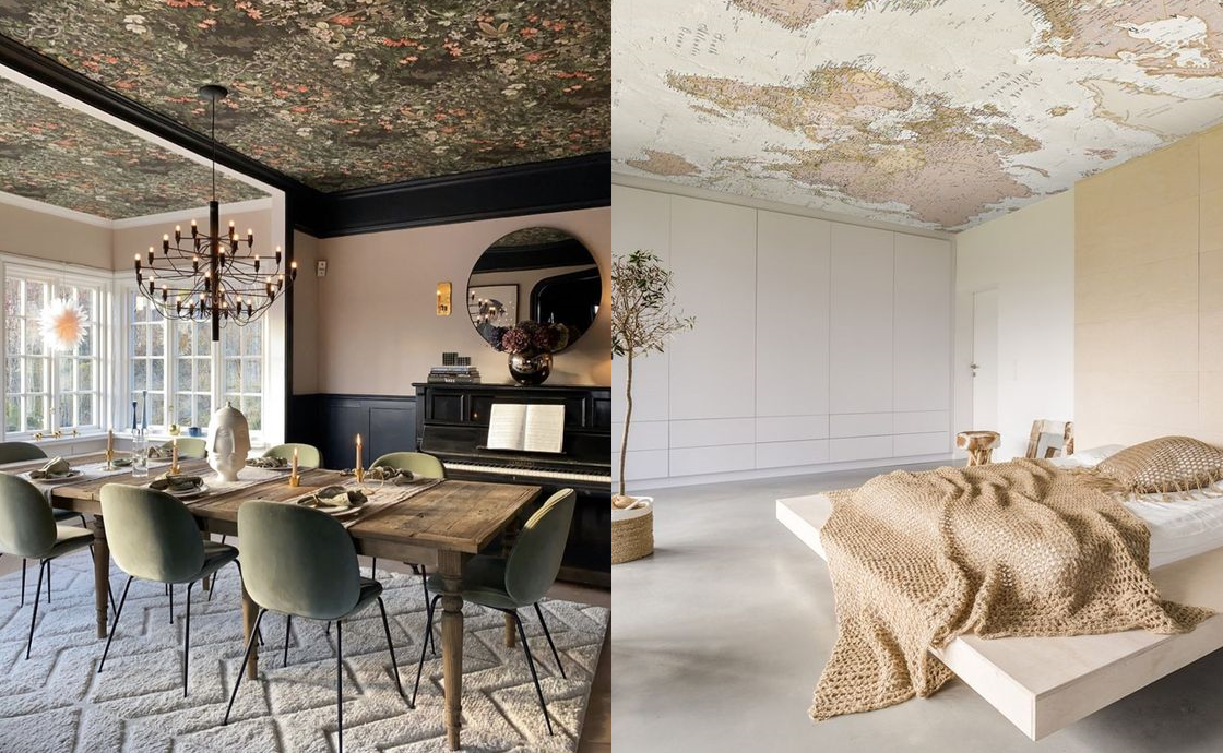 Так делали ещё в советских квартирах, теперь так делают в дизайнерских интерьерах. Если в первом случае любовь к обоям на потолке объяснялась скорее доступностью решения, теперь оно становится дизайнерским инструментом, с помощью которого можно добавить помещению дополнительный декоративный слой и визуальный объем, создать интересные оптические эффекты и зонировать пространство.