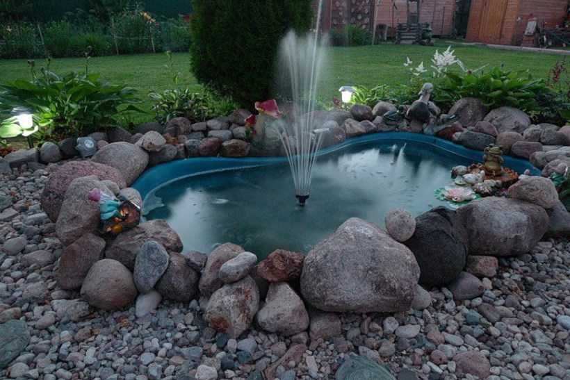 Если на вашей даче уже имеется искусственный водоем, а вам захотелось его как-то разнообразить, то готовый резервуар с водой также можно использовать в качестве основы для создания погружного фонтана.