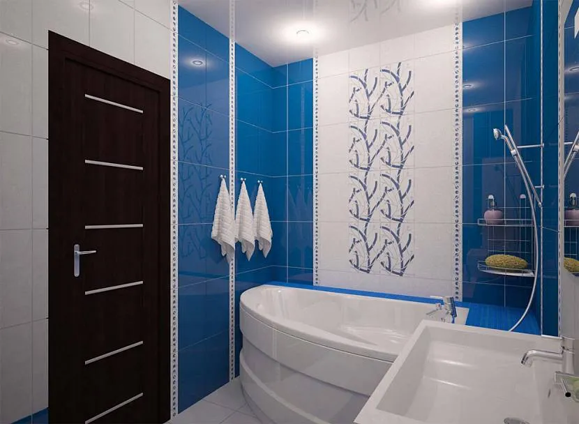 Синий цвет в сочетании с белой сантехникой и серебристыми элементами выглядит современно и стильно.