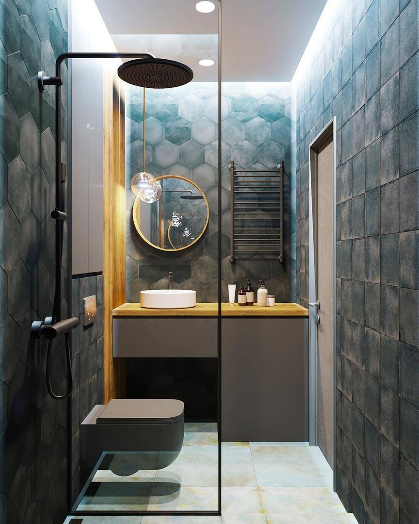 Т.к. для маленькой ванной мы выбираем современные стили дизайна, плитка должна соответствовать. Имитации дерева, камня, травертина, бетона — ок. Непонятная глазированная цветная плитка не имитирующая никакой материал — не ок. В 2020 году в ванных комнатах в моде именно натуральные материалы.