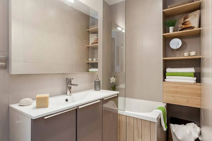 Если заменить стандартную ванну экземпляром уменьшенного размера и разместить его в углу, то рядом можно поставить вместительную полку, а возле двери умывальник с тумбой. Получится довольно стильно, компактно и функционально.