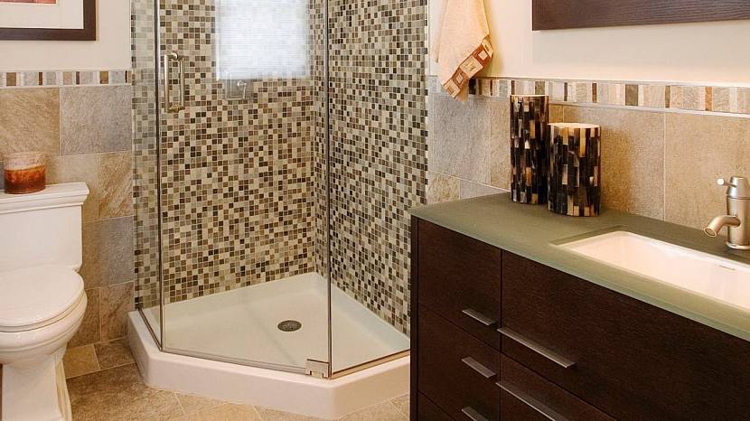 Вариант 3. Выбираем плитку крупного размера коричневых тонов. Ставим душевую кабину, справа от нее устанавливаем подвесной унитаз и раковину, над ними большое зеркало.