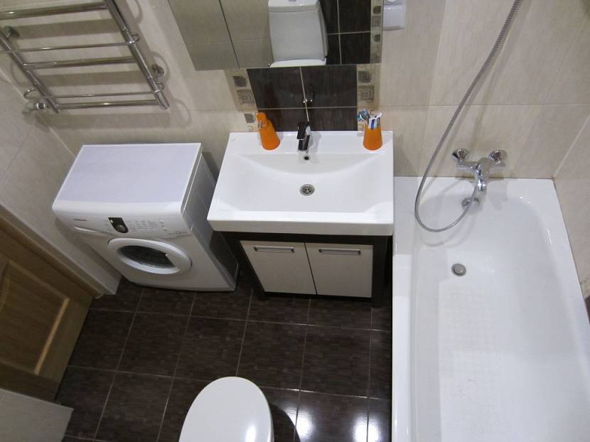 Вариант 4. В правом верхнем углу устанавливаем маленькую угловую ванну, эту зону выделяем плиткой. По левую сторону от нее унитаз и умывальник, а машину можно разместить в правом нижнем углу. Дизайн выполнен в бежево-коричневых тонах.