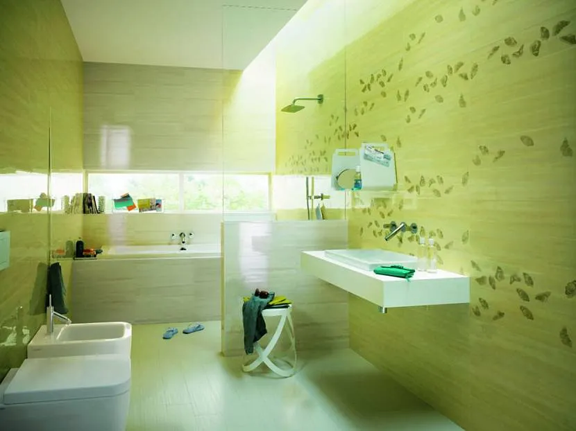 Оттенки зелёного способствуют энергетическому подъёму, восстановлению бодрости, укреплению физического и эмоционального состояния. Природный цвет хорошо сочетается со светлыми оттенками и деревянными поверхностями. На фоне зелёной отделки хорошо выделяется сантехника и бытовая техника белого цвета.
