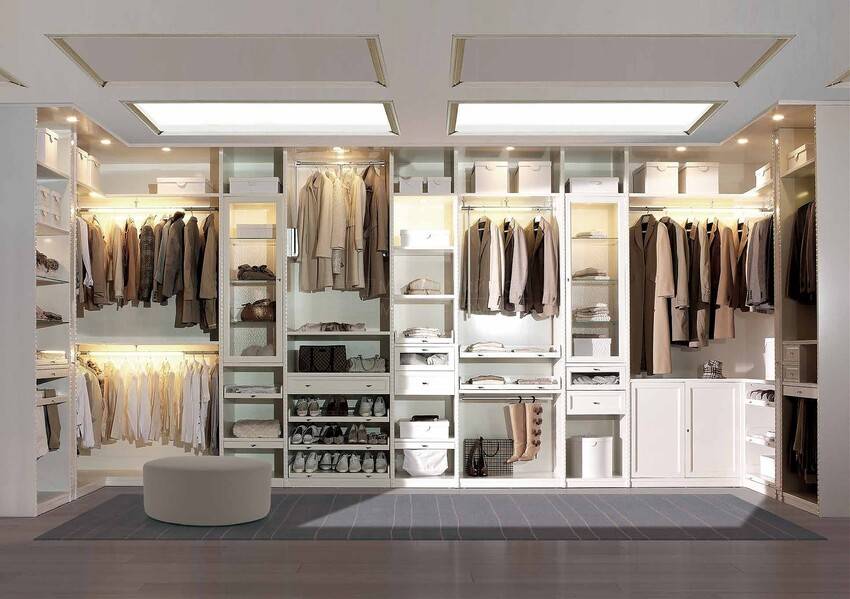 Поскольку основные затраты на устройство системы хранения приходятся на конструкцию перегородки, Г-образная система позволяет существенно сэкономить средства на гардеробной.