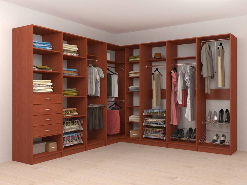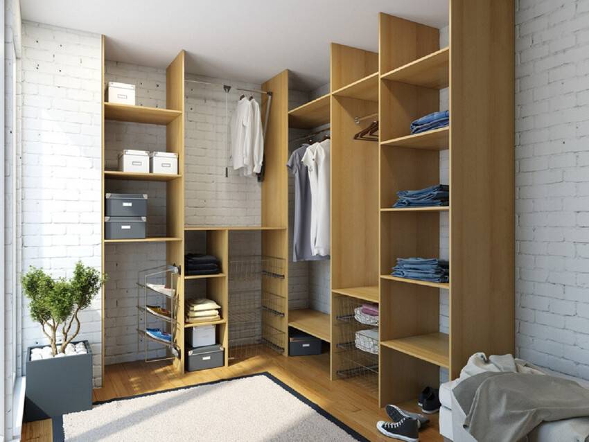 Для угловых систем применяют открытые стеллажи и стойки.Готовые идеи в проектах гардеробных комнат можно посмотреть в галереях в интернете.
