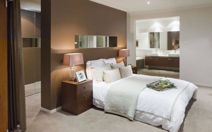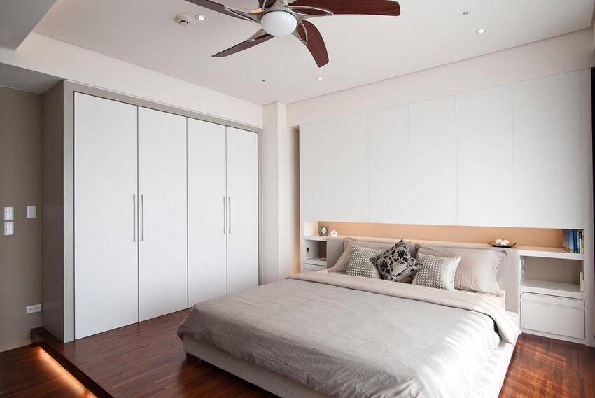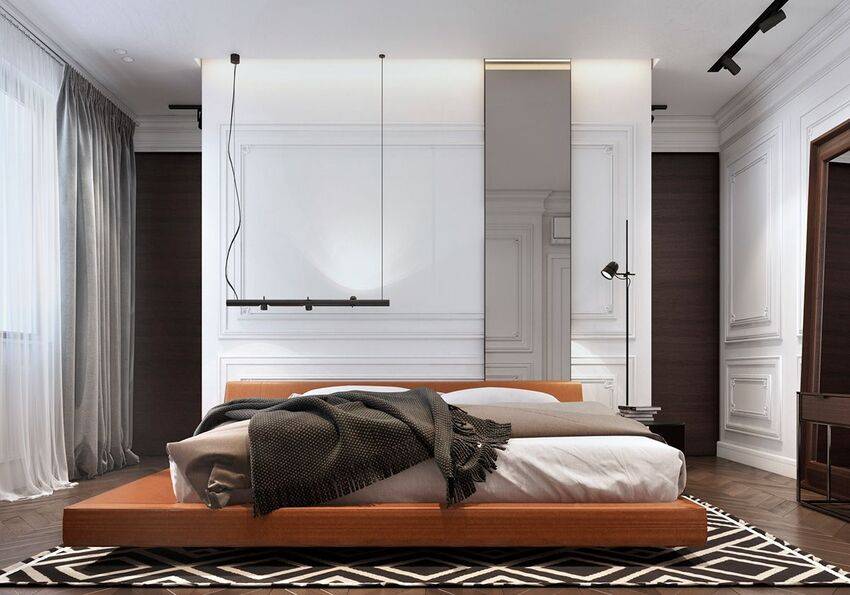 Отдельного внимания заслуживает дизайн угловой гардеробной в спальне. Фото готовых решений показывает, что для его реализации достаточно у изголовья кровати установить перегородку и отделить небольшой угол. Однако такое решение подойдет только для комнат с большой площадью.