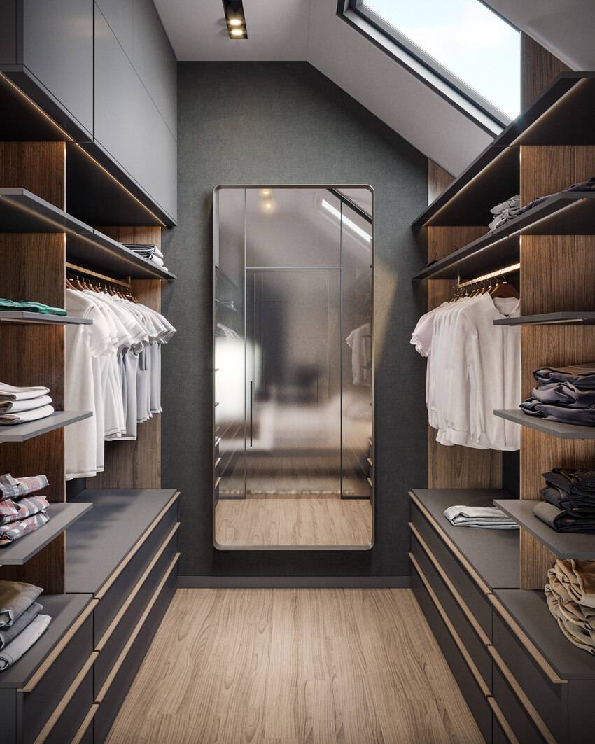 Освещение должно быть ярким. Во-первых, это необходимо чтобы быстро находить вещи, во-вторых, гардеробные комнаты часто используют как примерочные, чтобы сразу посмотреть, насколько сочетаются выбранные вещи. Зеркало при этом обычно располагают на двери или делают зеркальные двери. В этом случае свет должен быть направлен не только на полки и системы хранения, но и в зону примерки.