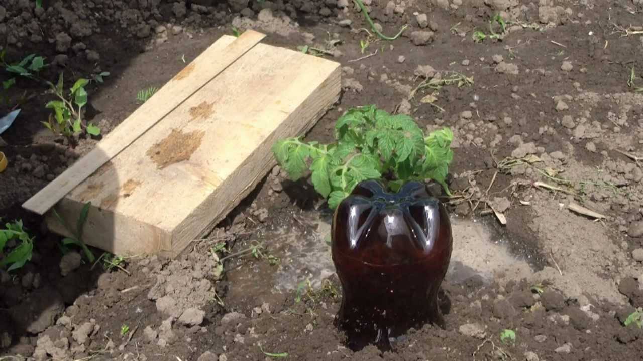 - если бутылки не вкопаны в землю, а подвешены на опоре, возможен ожог или загнивание листьев, на которые будет постоянно течь вода;