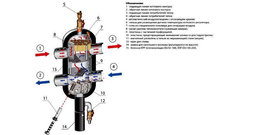 Нивелирование давления в контурах отопления. В системах с несколькими подающими трубопроводами, тяжело достичь одинаковых параметров скорости циркуляции теплоносителя. Циркуляционные насосы имеют разную производительность и скорость движения. При одновременном включении всех контуров отопления, некоторые из них могут полностью прекратить работать из-за недостаточного давления.После попадания вовнутрь гидравлического разделителя, происходит потеря давления, нивелирование параметров, что приводит к равномерному распределению тепловых потоков. Регулировка гидрострелки осуществляется автоматически, по мере включения и выключения циркуляционного оборудования датчиками.