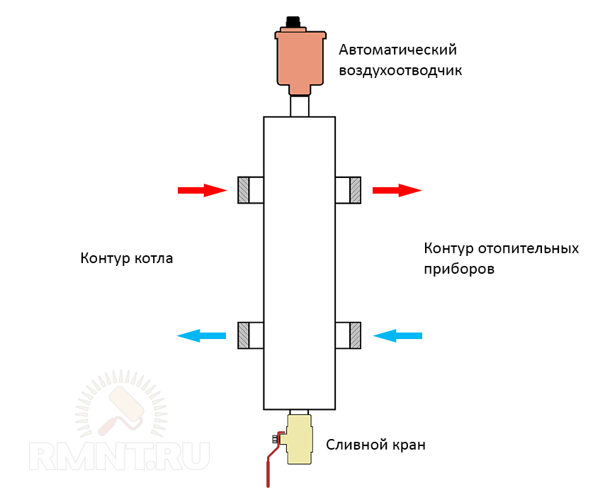 Кроме того в дно корпуса «стрелки» врезают штуцер с вентилем для слива теплоносителя из системы, а в крышку – штуцер с клапаном для удаления воздуха, который скапливается над водой (теплоносителем) и стравливается за счет давления в системе.